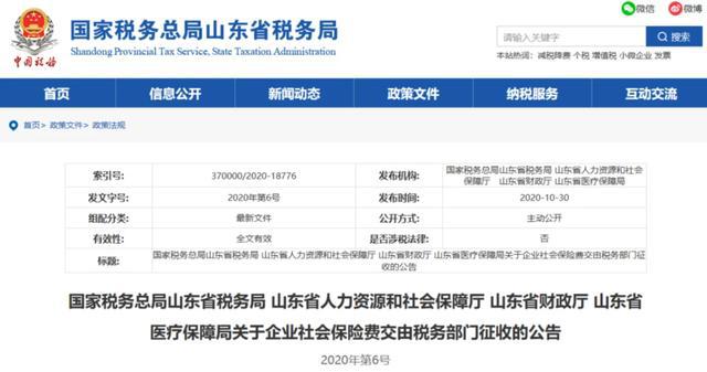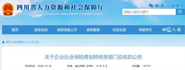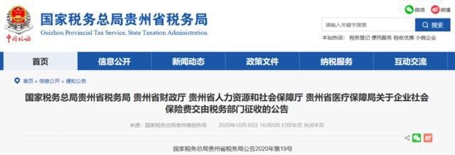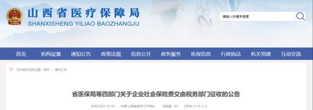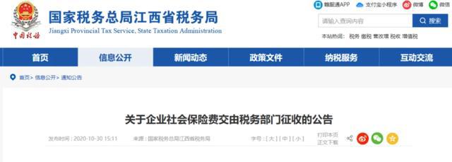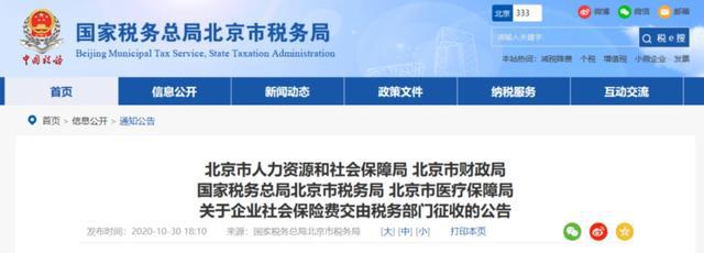 10月30日 北京、上海、山東、山西、湖南、四川、貴州、吉林、江西等地同時發(fā)布了《關(guān)于企業(yè)社會保險費交由稅務(wù)部門征收的公告》的通知。