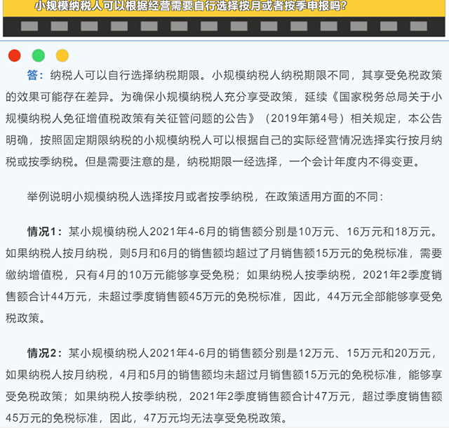 第二個(gè)問題:小規(guī)模納稅人可以根據(jù)經(jīng)營需要自行選擇按月或者按季申報(bào)嗎?