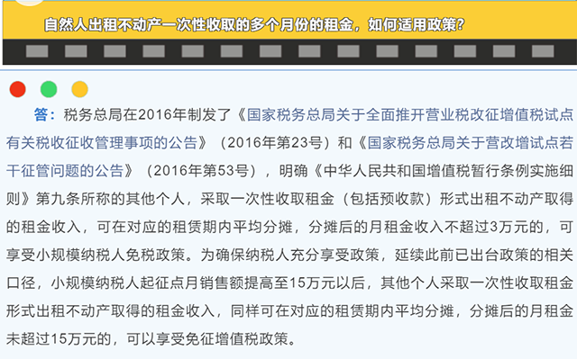 第三個(gè)問題:自然人出租不動(dòng)產(chǎn)—次性收取的多個(gè)月份的租金,如何適用政策?
