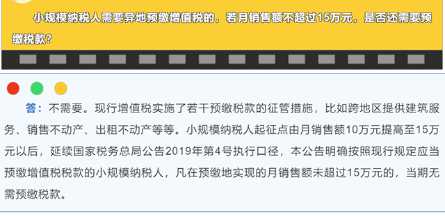 第四個(gè)問題:小規(guī)模納稅人需要異地預(yù)繳增值稅的。若月銷售額不超過15萬元。是否還需要預(yù)繳稅款?