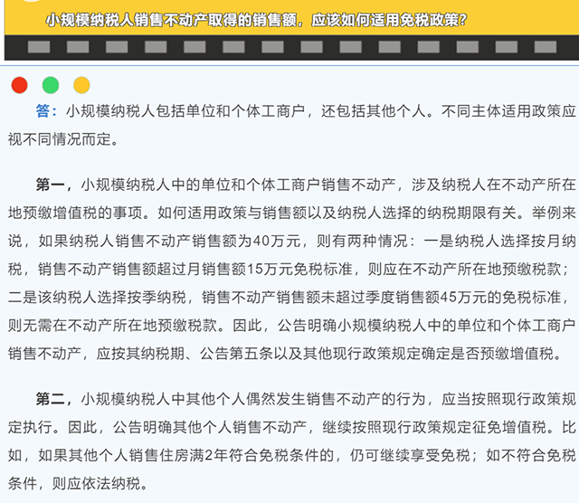 第五個(gè)問題:小規(guī)模納稅人銷售不動(dòng)產(chǎn)取得的銷售額,應(yīng)該如何適用兔稅政策?