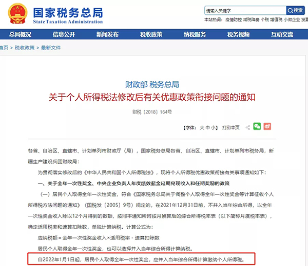 文件中明確:自2022年1月1日起,個(gè)人取得年終獎(jiǎng)不再適用優(yōu)惠算法,即不能再單獨(dú)計(jì)稅,應(yīng)并入當(dāng)年綜合所得計(jì)算繳納個(gè)人所得稅。
