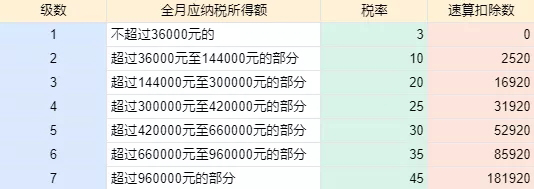 適用稅率:以全年一次性獎(jiǎng)金收入除以12個(gè)月得到的數(shù)額對照月度稅率表確定: