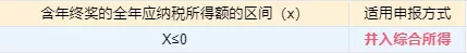 1、當(dāng)年收入(含年終獎(jiǎng))減去6萬及三險(xiǎn)一金、附加扣除等后應(yīng)納稅所得額≤0