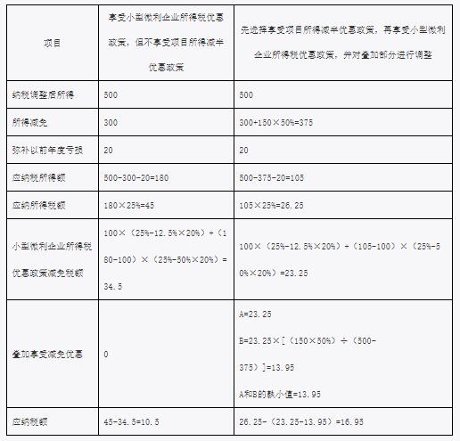 ▲在例1、例2情形下,企業(yè)應(yīng)選擇同時(shí)享受項(xiàng)目所得減半和小型微利企業(yè)優(yōu)惠政策。